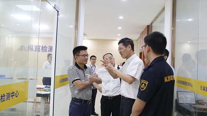 (汪會長在陳董事長的陪同下參觀公司展廳) (汪會長認真聽取縱覽集團董事長助理兼工廠副總監蘇宏發對公司產品的介紹) (雙方在縱覽集團檢測中心邊參觀邊交流) (汪會長在陳董事長的陪同下參觀車間) |