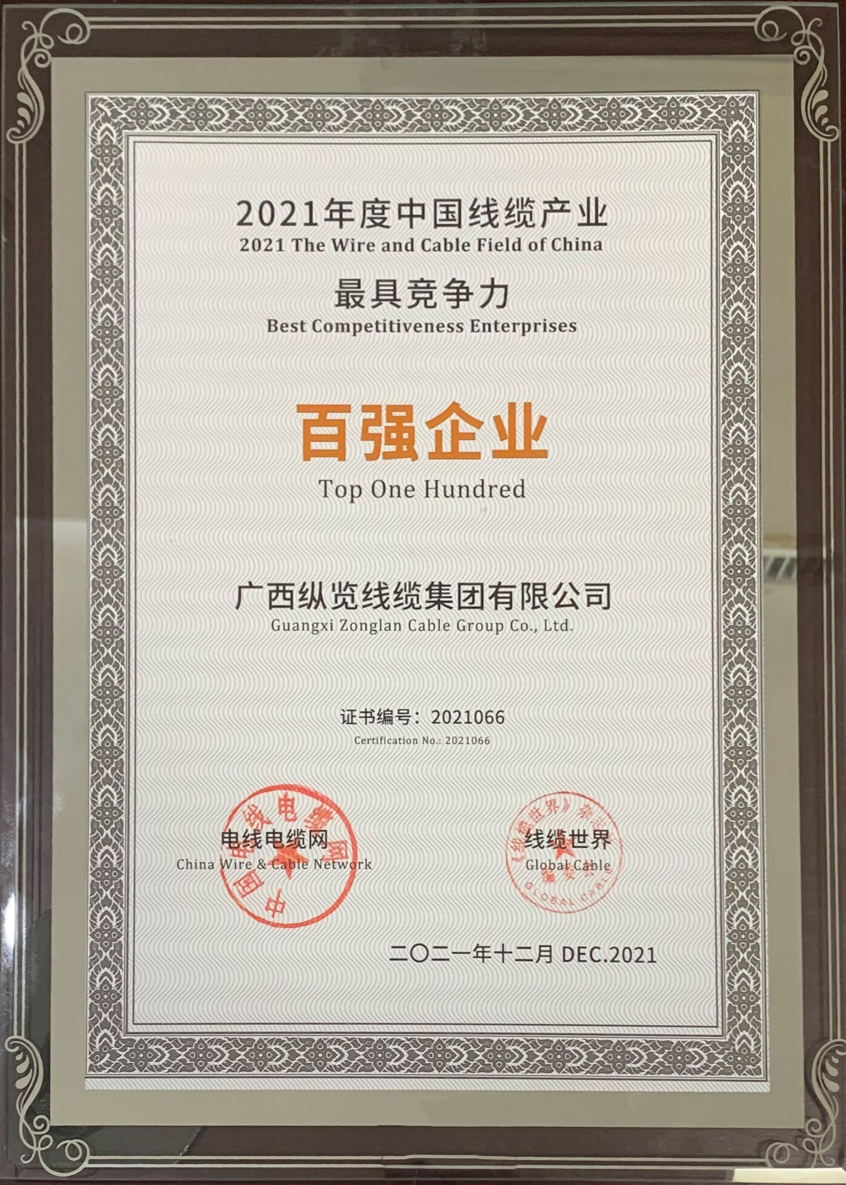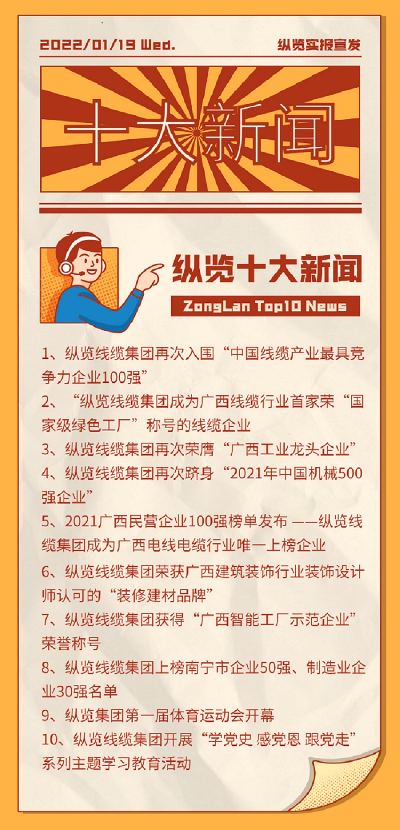 為了讓更多縱覽人主動(dòng)關(guān)心、了解公司的發(fā)展與成長(zhǎng),近期,縱覽線纜集團(tuán)開(kāi)展了2021年度十大新聞評(píng)選,通過(guò)縱覽人的投票評(píng)選,最終評(píng)選出公司十大新聞,這是縱覽人在2021年這個(gè)時(shí)間刻度上的標(biāo)記。2022是新的起點(diǎn),我們必將砥礪前行,一路劈波斬浪。 TOP. 01 縱覽線纜集團(tuán)再次入圍“中國(guó)線纜行業(yè)最具競(jìng)爭(zhēng)力100強(qiáng)” 12月20日,2021年度中國(guó)線纜產(chǎn)業(yè)最具競(jìng)爭(zhēng)力企業(yè)榜單揭曉,縱覽線纜集團(tuán)憑借強(qiáng)勁的實(shí)力、突出的競(jìng)爭(zhēng)力,榮膺“2021年度中國(guó)線纜產(chǎn)業(yè)最具競(jìng)爭(zhēng)力企業(yè)100強(qiáng)”。 多年來(lái),集團(tuán)始終致力科技引領(lǐng)、技術(shù)創(chuàng)新,實(shí)施綠色制造、智能制造工程,強(qiáng)化內(nèi)部管理,控本增效、質(zhì)量提升、精細(xì)服務(wù),以客戶為關(guān)注焦點(diǎn),以服務(wù)地方經(jīng)濟(jì)發(fā)展為己任,不斷提升行業(yè)競(jìng)爭(zhēng)力和品牌影響力,為廣西“強(qiáng)首府戰(zhàn)略”深入實(shí)施和廣西工業(yè)振興、社會(huì)經(jīng)濟(jì)高質(zhì)量發(fā)展作出應(yīng)有貢獻(xiàn)。