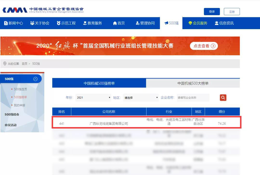 TOP. 04 縱覽線纜集團(tuán)再次躋身“2021年中國(guó)機(jī)械500強(qiáng)企業(yè)” 日前,2021年中國(guó)機(jī)械500強(qiáng)榜單發(fā)布,廣西縱覽線纜集團(tuán)有限公司是廣西電線電纜行業(yè)唯一上榜企業(yè)。在新冠疫情和原材料價(jià)格高漲疊加因素環(huán)境下,我集團(tuán)連續(xù)上榜中國(guó)機(jī)械500強(qiáng)企業(yè)榜單,充分彰顯了縱覽線纜集團(tuán)在科研技術(shù)、質(zhì)量管控、市場(chǎng)開(kāi)拓、創(chuàng)新發(fā)展上的綜合實(shí)力和高質(zhì)量發(fā)展的水平,將有力促進(jìn)縱覽品牌的美譽(yù)度和市場(chǎng)影響力。