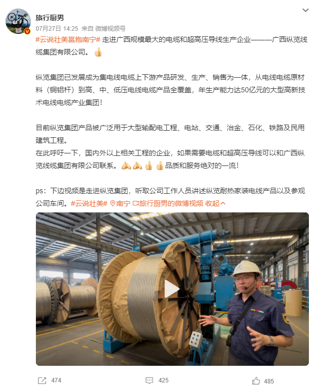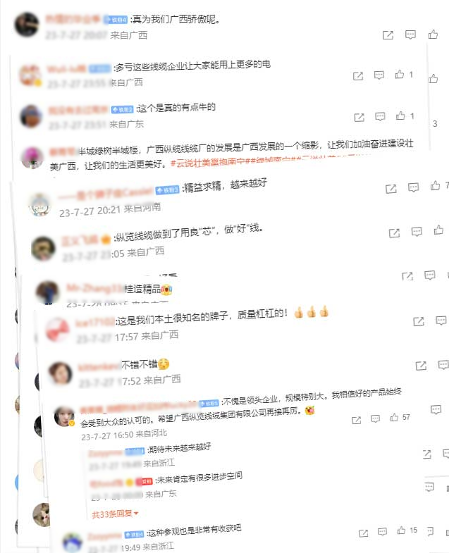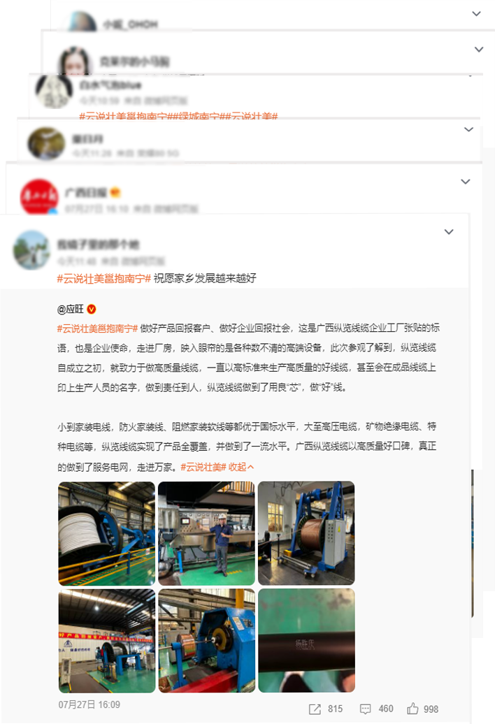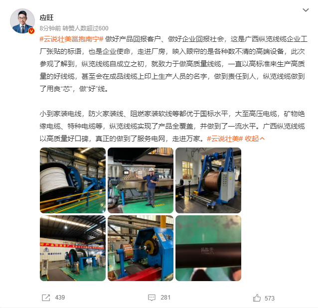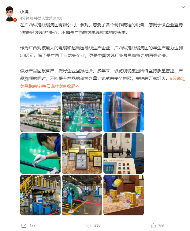 7月27日,由自治區網信辦組織的“云說壯美繪錦繡”——網絡名人看廣西主題活動走進縱覽線纜集團進行采風。來自全國各地近40位網絡名人、媒體記者在縱覽線纜集團感受了廣西線纜高端品牌的鑄就過程以及在服務地方社會經濟發展中所展現的作為擔當。董事長助理吳培軍、陳楊陪同接待,副總工程師蘇宏發為各位網絡名人全程講解,帶領大家一起探索縱覽線纜的奧秘。 活動期間,蘇宏發副總工用鮮活的語言向參訪團展示了縱覽線纜集團獨特的企業文化、平臺建設,深入車間感受工藝生產制造流程,切實感受電線電纜生產制造的過程,了解產品生產質量把控、產品監管、產品溯源等經營管理理念。 實地參觀后,董事長助理吳培軍向來訪的網絡名人們做了題為“廣西縱覽線纜集團高質量發展之路”的匯報。介紹了縱覽線纜集團在高質量發展道路上的做法、成效以及榮獲自治區主席質量獎、南寧市市長質量獎的過程,讓網絡名人團更加了解縱覽線纜集團作為全國工業品牌培育示范企業、廣西工業龍頭企業的使命擔當。 網絡名人@小滿在微博感慨:在廣西縱覽線纜集團有限公司,參觀、感受了各個制作流程的設備,感慨于該企業堅持“做最好的線纜”的決心,不愧是廣西電線電纜領域的領頭羊。 網絡名人@應旺:小到家裝電線、防火家裝線、阻燃家裝線等都優于國標水平,大至高壓電纜、礦物絕緣電纜、特種電纜等,縱覽線纜集團實現了產品全覆蓋,并做到了一流水平。廣西縱覽線纜以高質量好口碑,真正做到了服務電網,走進萬家。 網絡名人@旅行廚男在微博上感嘆縱覽線纜的產品,甚至為縱覽線纜集團打了一波廣告! 評論區也在為縱覽打call:“縱覽線纜做到了用良“芯”,做好線”;“真抓實干、奮力爭先,在推動廣西高質量發展上展現更大擔當、更大作為”;“做好‘芯’,牽好‘線’,廣西牌子,值得你擁有”.... 縱覽線纜集團專注“服務電網,走進萬家”戰略目標,堅持“做好產品回報客戶,做好企業回報社會,就是對黨和國家最大的忠誠”經營理念。作為廣西標桿企業、廣西工業龍頭企業、廣西名牌企業,縱覽線纜集團將不忘初心,堅持持續高質量發展,為壯美廣西經濟建設,積極貢獻縱覽力量。 |