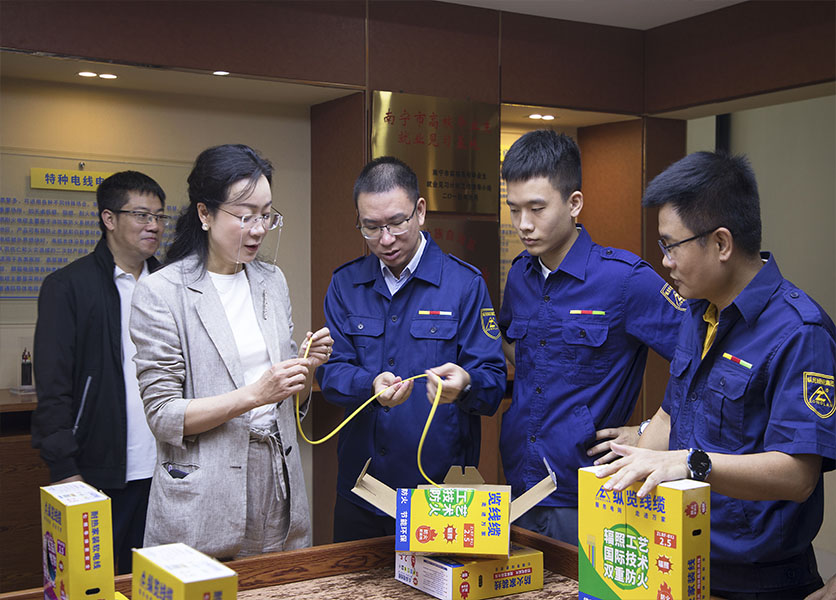 11月9日上午,廣西貿(mào)促會(huì)黨組書記、會(huì)長(zhǎng)楊雁雁在副會(huì)長(zhǎng)劉樹義陪同下率領(lǐng)相關(guān)部門負(fù)責(zé)人到縱覽線纜集團(tuán)公司考察指導(dǎo)工作。集團(tuán)董事長(zhǎng)陳秀銳及張彩菊、吳培軍、陳思行等領(lǐng)導(dǎo)陪同接待。 楊雁雁一行先后參觀了公司MES智能監(jiān)造系統(tǒng),榮譽(yù)展示廳、國(guó)家CNAS認(rèn)可實(shí)驗(yàn)室以及生產(chǎn)車間。 隨后,在雙方座談交流中,陳秀銳向楊雁雁一行介紹了縱覽線纜集團(tuán)發(fā)展歷程、經(jīng)營(yíng)理念和應(yīng)對(duì)當(dāng)前國(guó)內(nèi)外市場(chǎng)嚴(yán)峻形勢(shì)公司保持穩(wěn)健發(fā)展做法,并請(qǐng)求廣西貿(mào)促會(huì)、廣西國(guó)際商會(huì)在公司深入擴(kuò)展海外市場(chǎng)、提升縱覽國(guó)際品牌影響力方面給予更大的支持和幫助。楊雁雁對(duì)縱覽線纜集團(tuán)19年來(lái)注重產(chǎn)品質(zhì)量、科技創(chuàng)新、品牌建設(shè)、合規(guī)管理,誠(chéng)實(shí)守信經(jīng)營(yíng)、堅(jiān)實(shí)履行社會(huì)責(zé)任,將縱覽品牌打造成全國(guó)行業(yè)內(nèi)的知名品牌、廣西龍頭企業(yè)、質(zhì)量管理標(biāo)桿的做法給予高度評(píng)價(jià)。她表示,通過對(duì)縱覽線纜集團(tuán)的了解,下一步貿(mào)促系統(tǒng)要充分發(fā)揮對(duì)接供需、銜接內(nèi)外的橋梁紐帶作用,著力做好服務(wù)企業(yè)貿(mào)易促進(jìn)、商事服務(wù)、搭建溝通平臺(tái)等重點(diǎn)工作,協(xié)調(diào)解決企業(yè)在對(duì)外貿(mào)易中遇到的困難和問題,把產(chǎn)品優(yōu)勢(shì)性擴(kuò)大化,助力企業(yè)和地方經(jīng)濟(jì)高質(zhì)量發(fā)展。 |