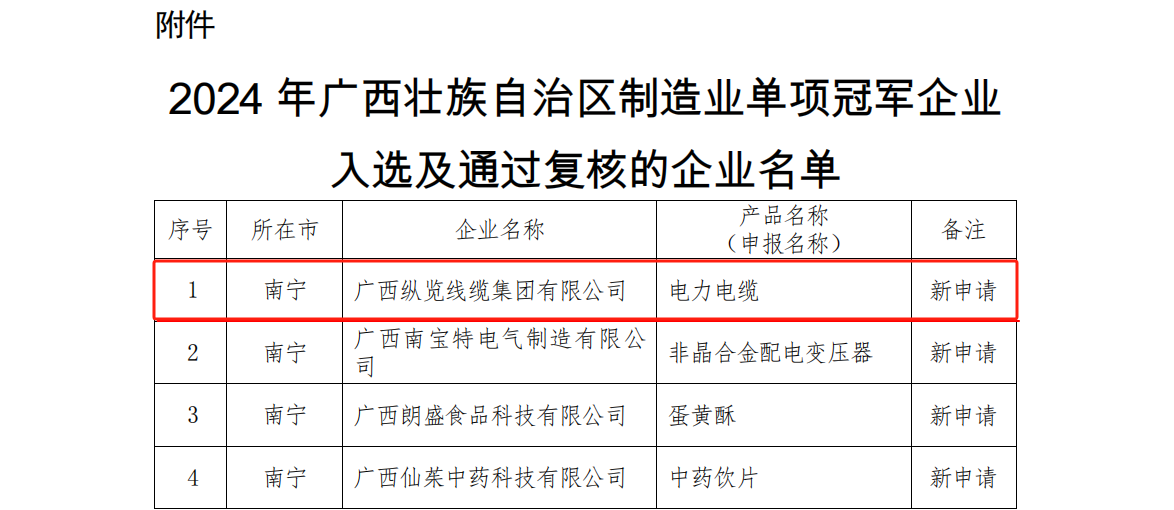 近日,自治區工業和信息化廳正式公示2024年自治區制造業單項冠軍企業名單,其中涉及多個當下熱門的制造業創新領域,經過遴選和復核評價工作,廣西縱覽線纜集團有限公司憑借卓越的綜合企業實力,被授予2024年【廣西壯族自治區制造業單項冠軍企業】稱號! 據悉,自治區制造業單項冠軍的評選,目的在于激勵和表彰在制造業領域具有顯著技術創新能力和市場競爭力的企業。評選過程中,專家組對參評企業的技術實力、產品創新能力、市場表現等多個維度進行全面評估,最終評選出了包括廣西縱覽線纜集團有限公司在內的33家企業為單項冠軍企業。 此次獲得單項冠軍的榮譽,對縱覽線纜集團而言,既是對其過往努力的肯定,亦是對其未來發展的激勵。展望未來,集團將致力于發揮制造業單項冠軍企業的示范與引領作用,持續秉承以“做好產品回報客戶,做好企業回報社會”的企業使命,堅持以技術創新為核心,不懈努力提升產品質量與服務水平,致力于為用戶提供更加優質、高效的電線電纜產品和服務。此外,公司亦將積極投身于行業內的交流與合作,為推動行業高質量發展蓄勢賦能。 |